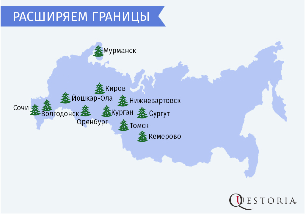 Квестория открылась в Йошкар-Оле, Сочи, Оренбурге, Нижневартовске, Сургуте, Томске, Кургане, Кемерово, Кирове, Волгодонске, Мурманске. Всего присоединилось 11 городов.